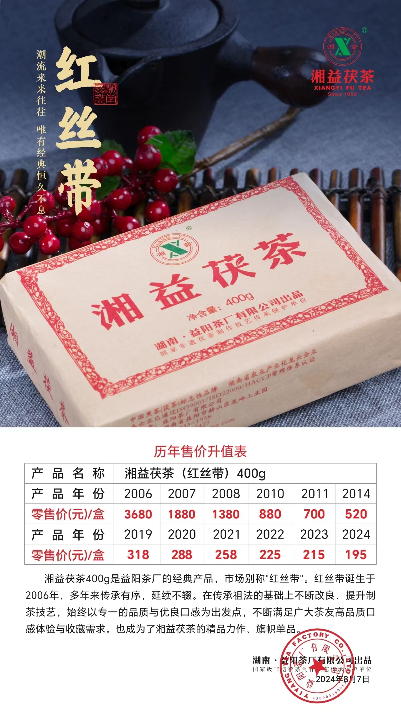 紅絲帶誕生于2006年,多年來(lái)傳承有序,延續不輟。它延續的不僅僅只是產(chǎn)品,更是精益求精的品質(zhì)與口感。湘益茶人在傳承祖法的基礎上不斷改良、提升制茶技藝,始終以獨特的品質(zhì)工藝與優(yōu)良口感為出發(fā)點(diǎn),不斷滿(mǎn)足廣大茶友高品質(zhì)口感體驗與收藏需求。在制茶匠人數十年如一日的精雕細琢、茶友們日復一日年復一年的口感認證之下,紅絲帶成為了湘益茯茶的精品力作、旗幟單品。
