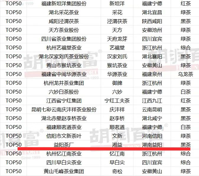 5月,胡潤研究院發(fā)布《2025胡潤中國茶葉領(lǐng)域典范企業(yè)榜》,益陽(yáng)茶廠(chǎng)有限公司憑借其深厚的行業(yè)積淀、卓越的品牌價(jià)值及持續創(chuàng )新力再度躋身榜單,這是繼去年登榜后,益陽(yáng)茶廠(chǎng)又一次獲此殊榮,進(jìn)一步鞏固了其在中國黑茶領(lǐng)域的龍頭地位及行業(yè)標桿形象。